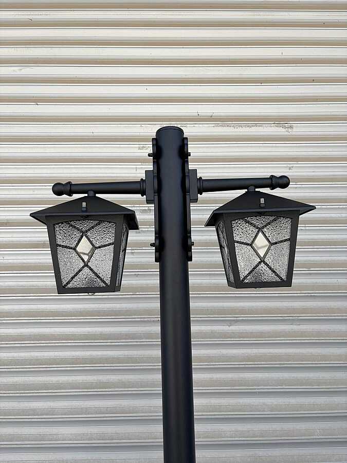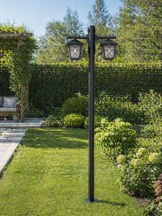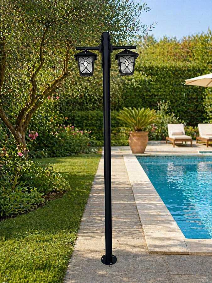 Dış mekânlarınıza estetik ve güçlü bir aydınlatma katmak isteyenler için tasarlanan bu çift kollu direk üstü bahçe armatürü, klasik ve modern çizgileri bir araya getirir.